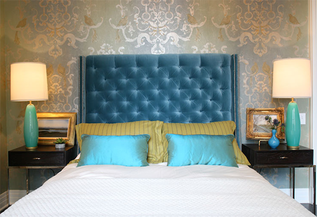 Vẻ yên bình là ưu thế trong ánh sáng của màu này. Sắc xanh mát trên tường kết hợp với họa tiết làm cho không gian của phòng ngủ trở nên bừng sáng và thanh thoát