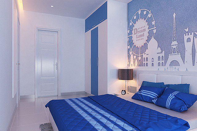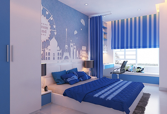 Màu xanh lam là màu duy nhất duy trì được chính mình khi phải đứng cạnh các màu khác. Màu xanh lam kêt hợp với những gam màu tươi sáng khác mang lại điểm nhấn hoàn hảo cho phòng ngủ