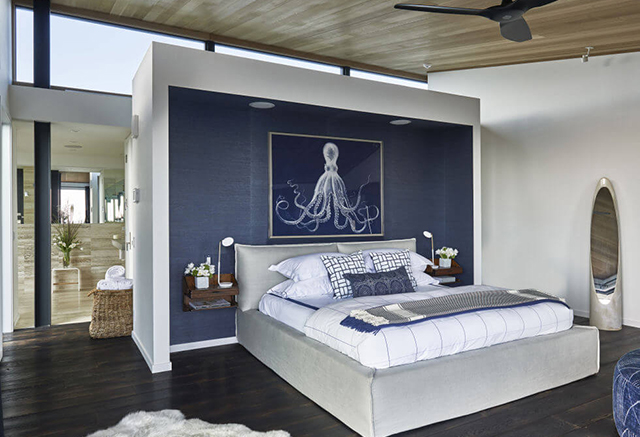 Màu xanh denim giúp cân bằng với các yếu tố trang trí đơn giản và sắc thái nhẹ nhàng. Với sự kết hợp cùng màu trắng mang đến không gian trang nhã cho phòng ngủ